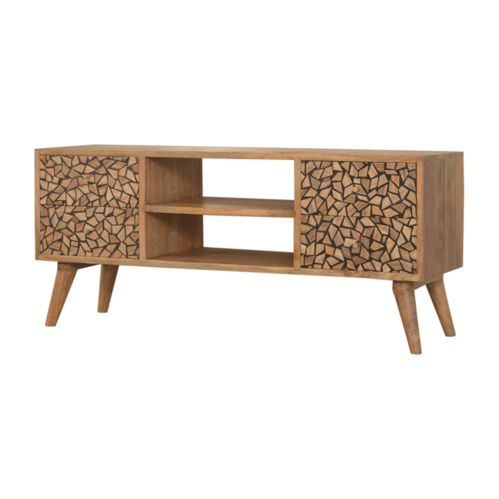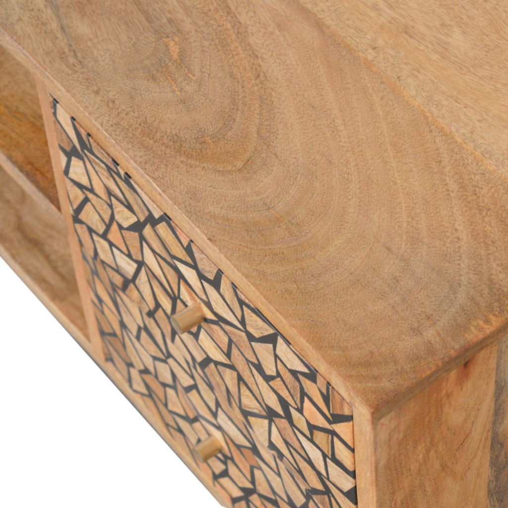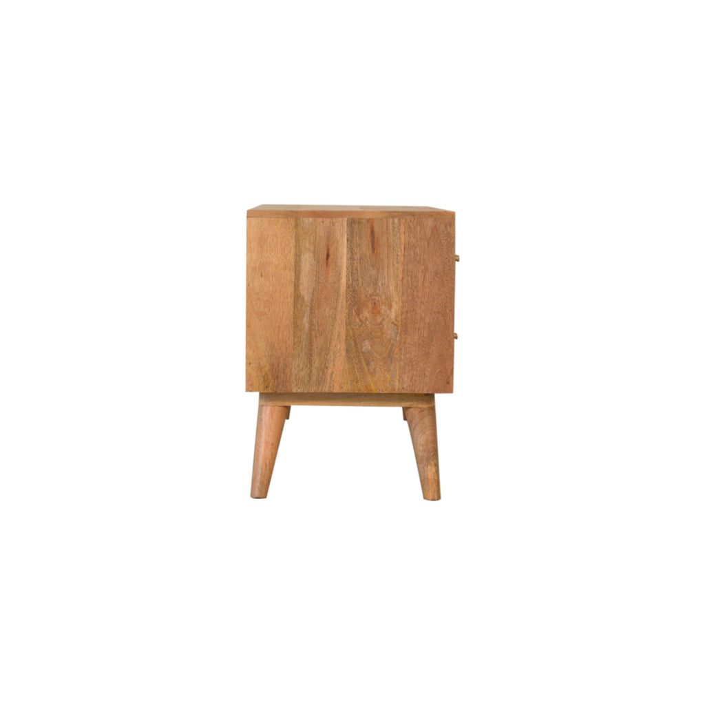 This media unit has been constructed from 100% solid mango wood in a oak-ish finish. It has 2 drawers and 2 open slots for storage convenience and features nordic style legs with shiny brass knobs which give a lovely contrast against the print. More items available from the Lisbon range.