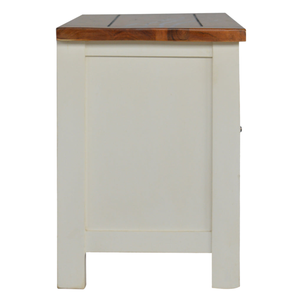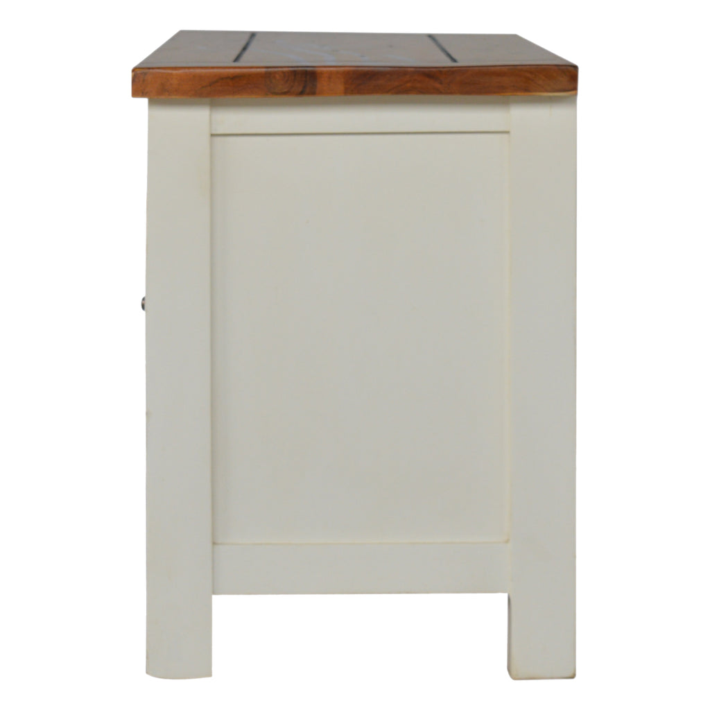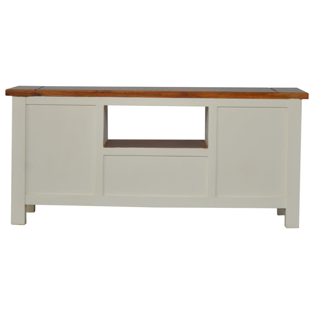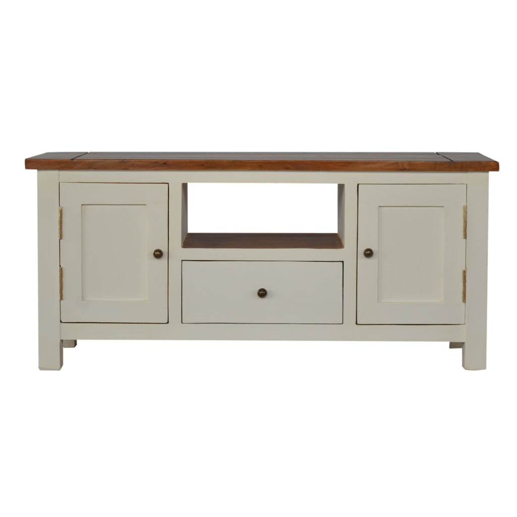This 2 toned media unit has a white hand spray painted base which is constructed from solid mango wood and a rich honey finish top which is constructed from solid acacia wood. It comes with 1 drawer, 2 door cabinets and 1 shelf also there is a decent sized top to place a TV. Other features include shiny brass knob handles; straight farmhouse feet and the drawer inners have a rich honey finish.