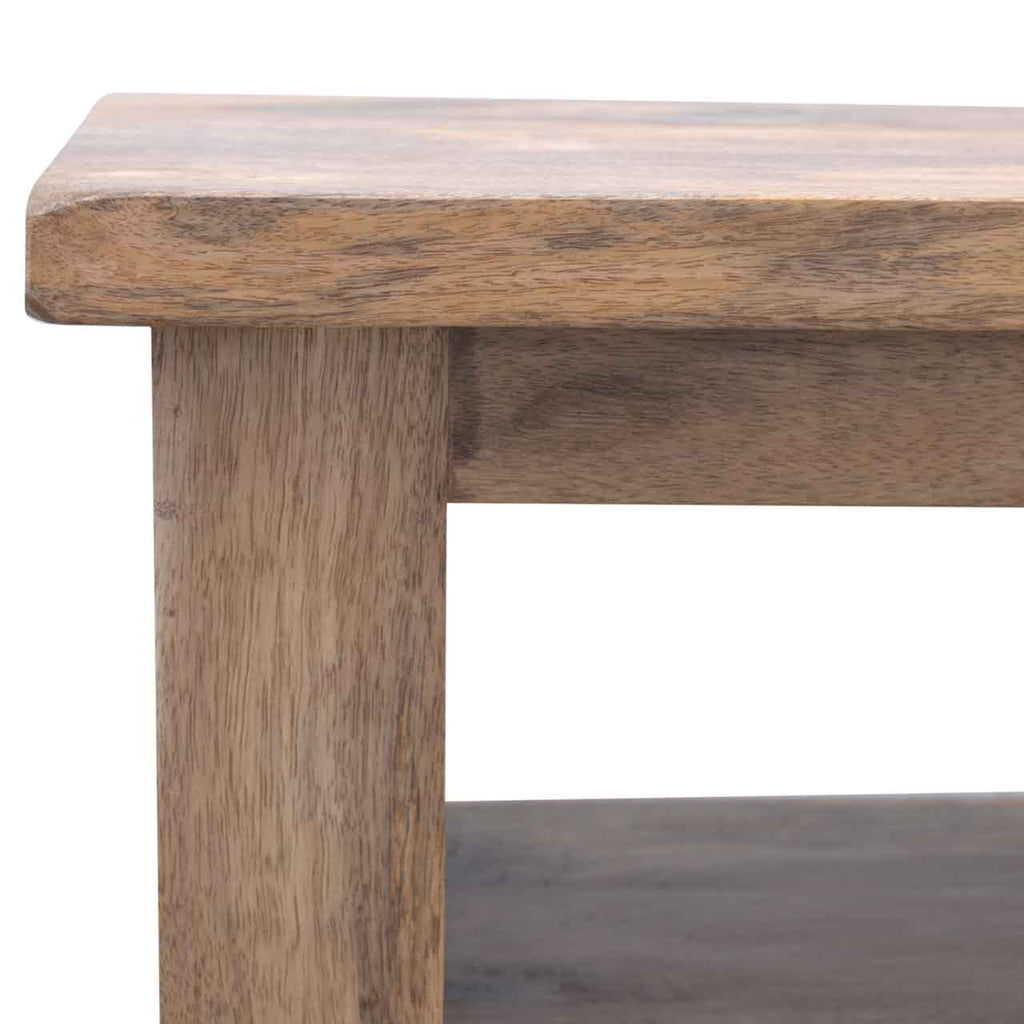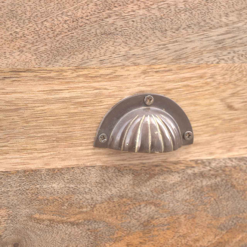 This 3 Drawer, two shelf country style media unit has been made from 100% solid mango wood and features farm house feet, shiny shell handles, oak-ish finish and a chunky mango wood top. This unit is perfect for an entertainment system. Its drawers can hold DVDs, CD's, etc. while the shelves can hold the additional appliances like Sky boxes, etc. As for a TV, the unit can support a small to medium sized TV on the top.