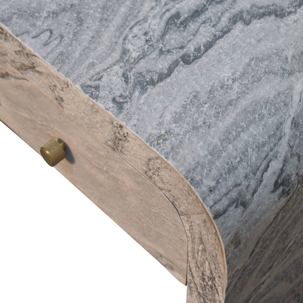 Introducing the "Nouveau" Media Unit, a symbol of refined luxury. Crafted from Solid Mango wood with an oak-ish finish inside the drawers, the body features a laminated marble effect stone veneer. Adorned with a shiny brass round knob, and 2 drawers, this media unit exudes opulence and sophistication, making it a timeless addition to any upscale living room.