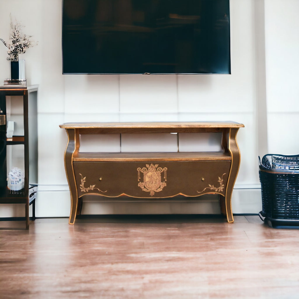 Discover elegance with the Coroner Collection Medis Unit, a French-style masterpiece in a unique greyish-green finish with a natural top and inside the drawers. Made from solid mango wood, this nightstand table features a hand-painted, sketched crown crest design, adding a royal touch to your bedroom. The design is complemented by sophisticated Chantilly legs and shiny brass knobs, blending functionality with luxury. Ideal for those who cherish a blend of elegance, durability, and historical charm in their home decor, this piece is destined to become a family heirloom.
