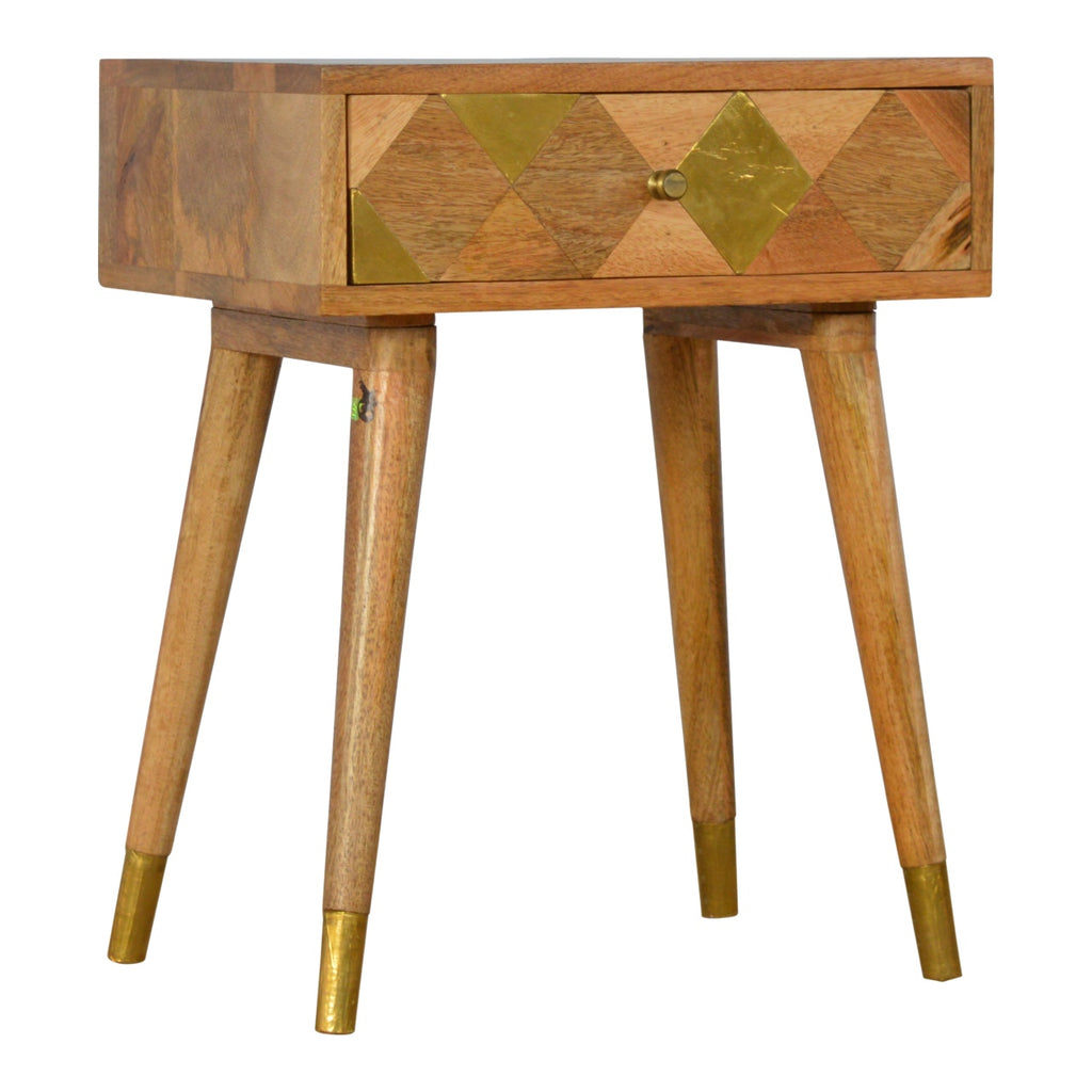 Endlessly versatile, this nightstand table has a beautiful golden brass insert on the drawer front with 4 Scandinavian style legs which have golden plating on the legs for extra detail. It makes a perfect stand for nibbles, drinks or a lamp. It will prove handy all over your home and is made from 100% solid mango wood with a fine oak-ish finish. Every piece of furniture is individually handcrafted and includes swing care tickets explaining the cautions and aftercare instructions.