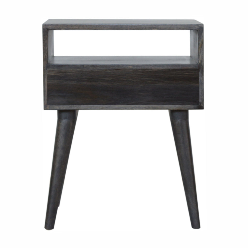 This beautiful nightstand displays a carefully carved drawer front with a shiny chrome coated knob allowing easy access into the drawer and making it easy to store and use bits you wish to keep close before bedtime. It has been constructed from 100% solid mango wood in an ash black finish and stands on Nordic style legs. The perfect modern and timeless piece for the bedroom.