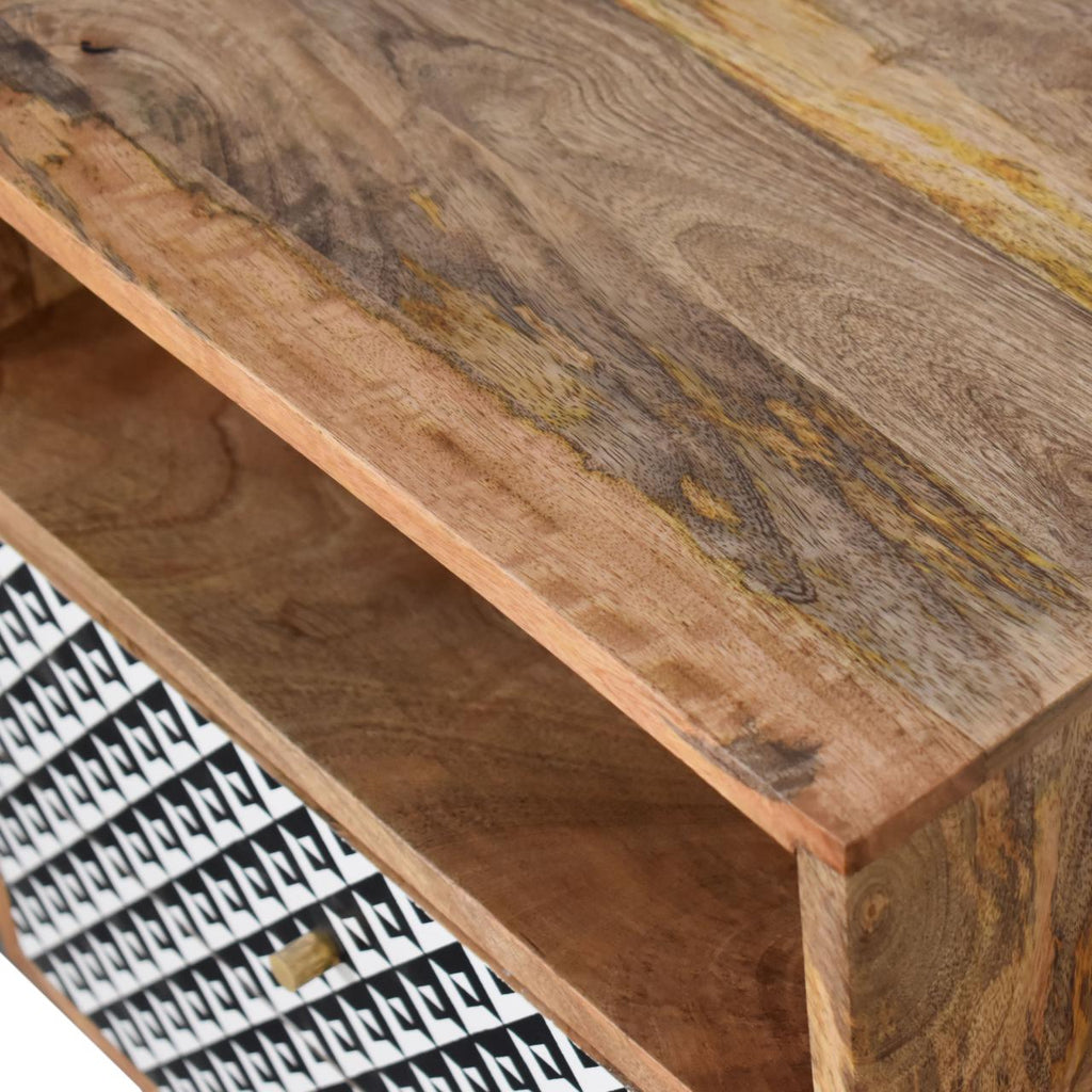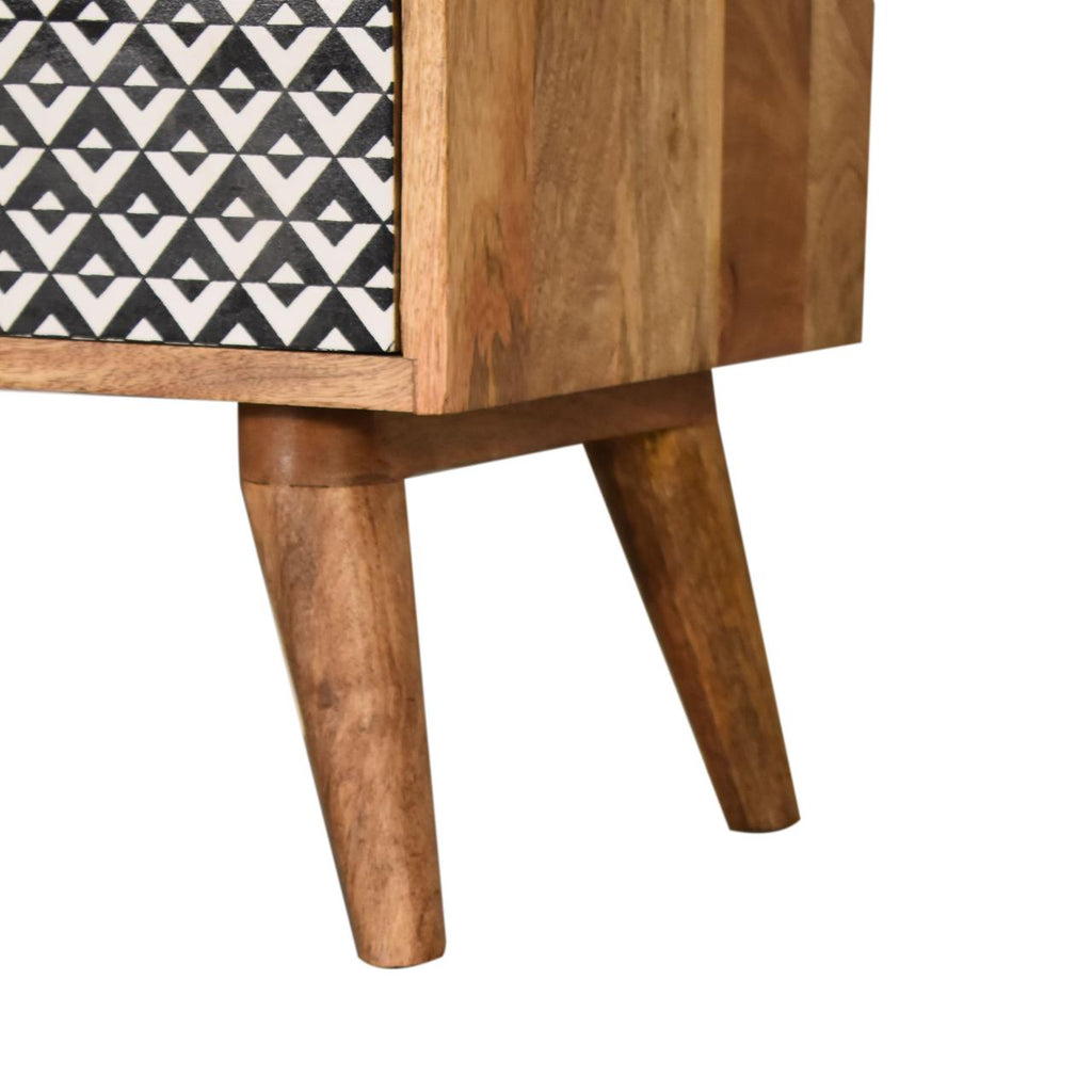 This nightstand has been constructed from 100% solid mango wood in a fine oak-ish finish. The 2 drawers feature a black and white screen printed pattern which is bound to uplift your bedroom and allow you to store any bits and pieces discreetly. It also has 4 Nordic style legs and ample space on top for a lamp, photo frames or ornaments.