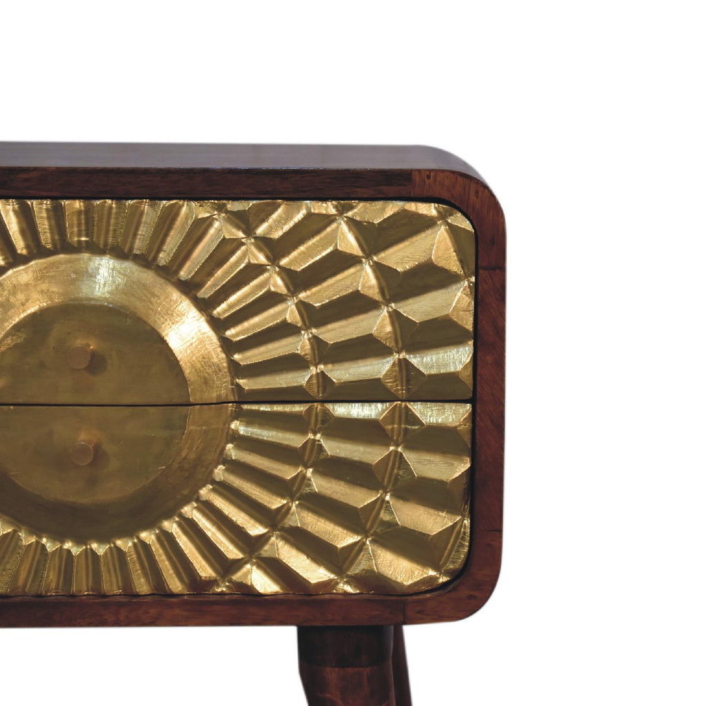 This Eden Curved nightstand is made of solid mango wood, with a chestnut finish structure. It has 2 curved spacious drawers for convenient storage space and ample space on top to display a photo frame, candle or lamp. Additionally, the exquisite craftsmanship and beautiful gold brass sheet provide a beautiful carved pattern on the drawer fronts making this an all-round eye-catching piece of furniture in your bedroom