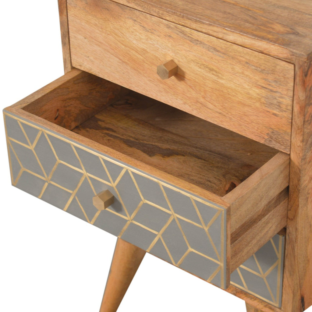 This nightstand has been inspired by a clean and modern design. It has been constructed from 100% solid mango wood in an oak-ish finish and features 2 gold dice patterned drawers which blend beautifully with the grain pattern of the wood. Other features include nordic style legs and shiny brass knobs.