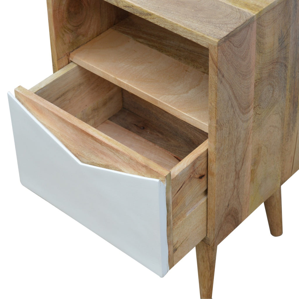 This petite hand-painted nightstand offers both style and storage space with its minimalist yet stylish design. It has been constructed from 100% solid mango wood in an oak-ish finish and features one put-out drawer with a white envelope style drawer front. The open slot allows you to discreetly store any smaller bits and the top allows space to store any lamps, ornaments or plants. It stands on 4 Nordic style feet and is the perfect addition for the bedroom