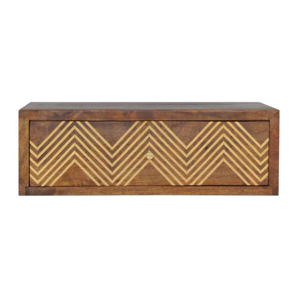This minimalistic wall-mounted nightstand has been constructed from 100% solid mango wood in a chestnut finish and features 1 brass-inlay chevron pattern drawer with a shiny knob. This piece is perfect for storing any bits and pieces you wish to keep close by before bedtime. Its neat and clean design can easily be mounted on the wall without the fuss of any legs. Caution! Do not sit on the unit.