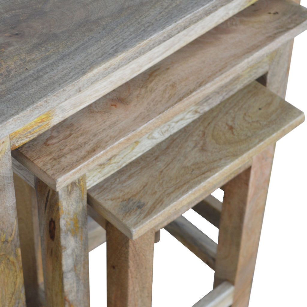 This stool set of 3 is made of 100% mango wood and is perfect for providing extra seating for guests or for everyday use. These strong stools are functional and easy to tuck away when not in use. The stools also work as side tables providing excellent versatility. With their compact size these stools are perfect for use in small spaces and they tuck away when they're not in use. Each stool is individually hand distressed for a unique look; no two pieces are identical. This piece of furniture has an oak-ish finish. Sold as a Set of 3.