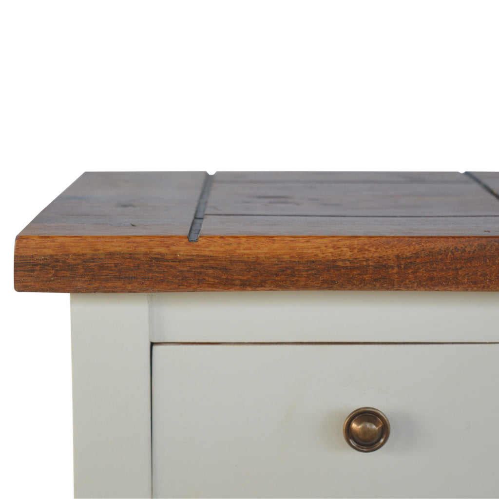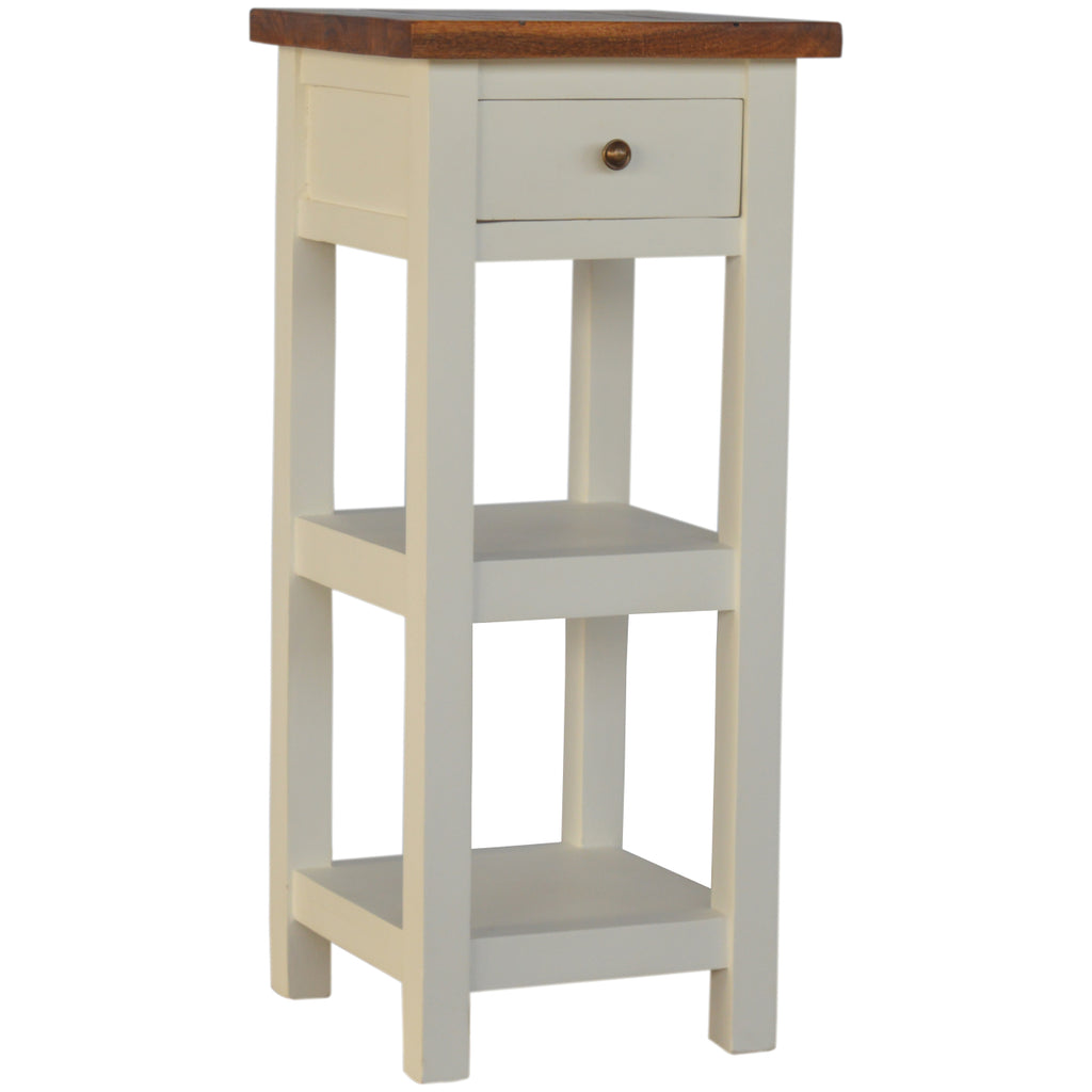This 2 toned telephone table has a white hand spray painted base with a rich honey finish top. The base of the telephone table is constructed from solid mango wood and the top is constructed from solid acacia wood. It comes with one drawer and 1 shelves, other features include round knobs, straight farm house legs and the inner of the drawer has a rich honey finish.
