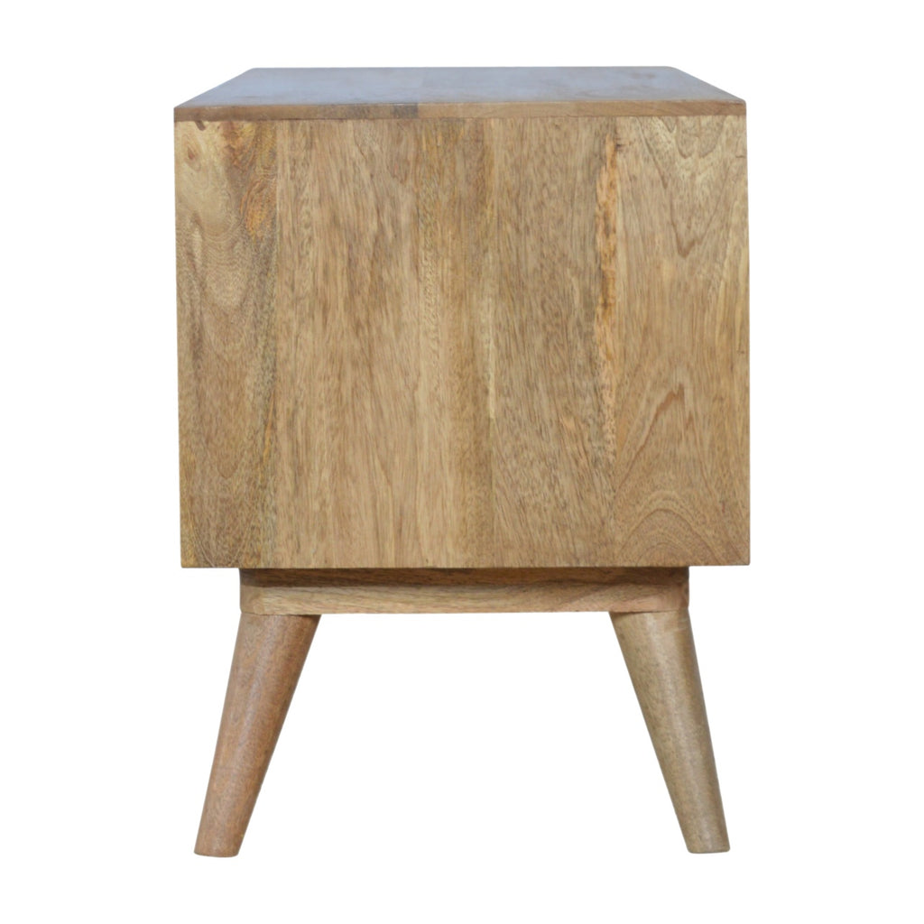 This Nordic gradient style media unit will bring a whole new look to your home, with its simple yet modern and beautiful design this piece is constructed from 100% solid mango wood and has a fine smooth oak-ish finish. It has useful storage with 4 spacious drawers that are individually hand painted with 2 tones of grey and 2 shelves for displaying any bits you wish to show off in the home. Some other features include 4 Nordic style legs and cut handles for the drawers. Every piece of furniture is individually handcrafted and includes swing care tickets explaining the cautions and aftercare instructions.