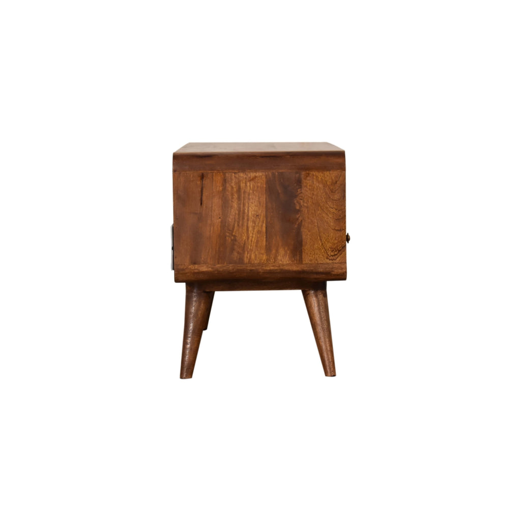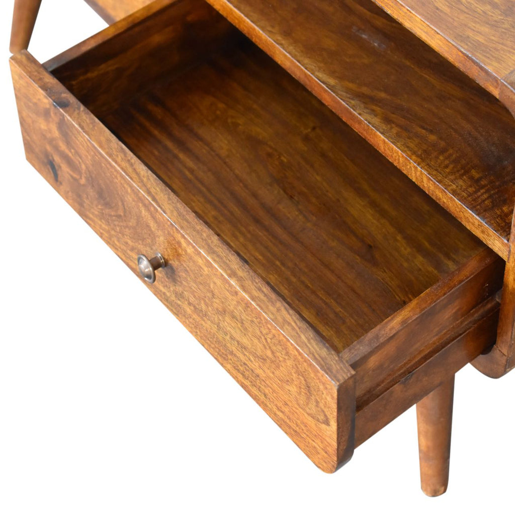 Our solid timber media unit is expertly constructed from 100% solid mango wood in a lovely chestnut finish. This modern design offers clean, curved edges to suit most homes. Some features include 2 drawers that come with a shiny knob, a large open slot to place any books, photo frames, ornaments, and 4 Nordic-style legs. Cable access is provided which allows you to plug in any electronic devices with no fuss.