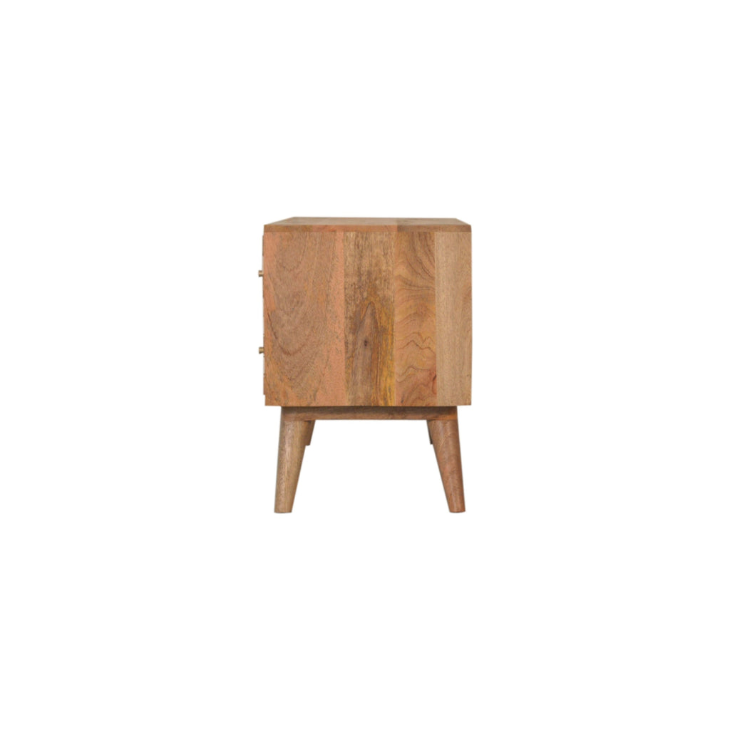 This media unit has been constructed from 100% solid mango wood in a fine oak-ish finish. The 2 doors feature a black and white screen printed pattern which is bound to uplift your living room and allow you to store any bits and pieces discreetly. It also has 4 Nordic style legs, 2 open slots and ample space on top for a TV.