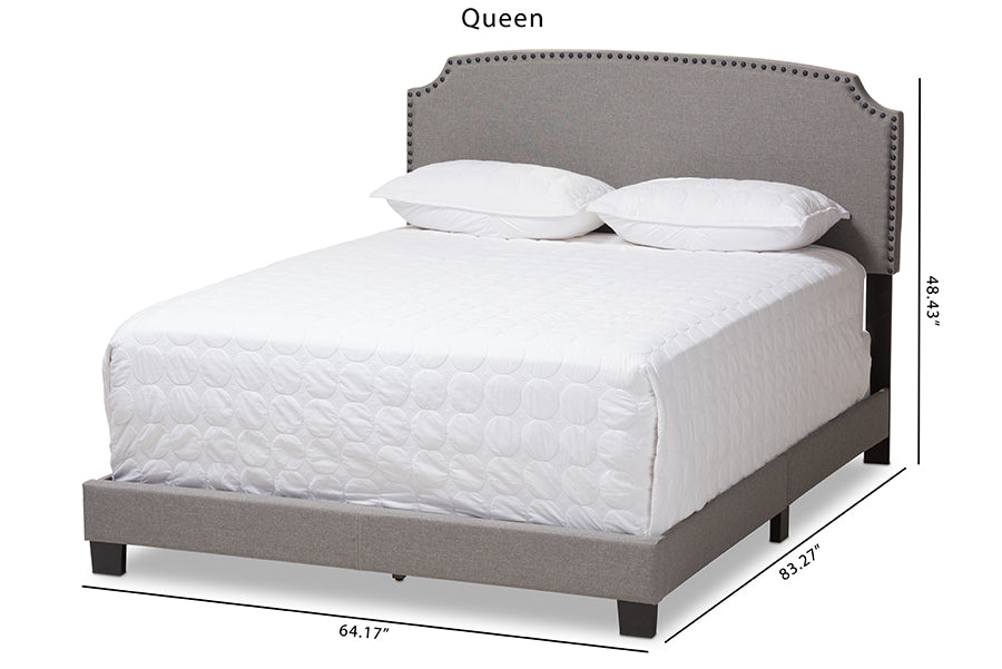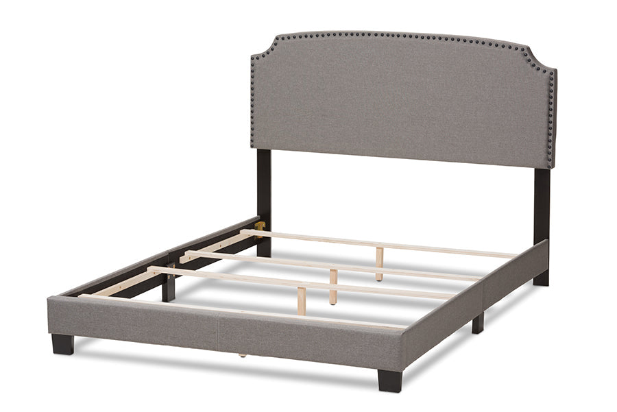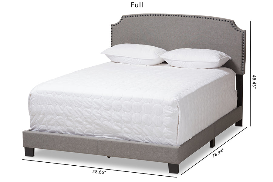 The Schiuma full size bed has a style that is both contemporary and timeless. The modern and contemporary-inspired design is versatile and easy to coordinate with your décor. The Schiuma features light grey fabric upholstery and a low profile footboard styling. The curvaceous headboard is padded and has a stylish nailhead trim. Refresh your guest room with the Schiuma, or keep the style for yourself in your own bedroom. This bed is made for use with a box spring and mattress. Made in Malaysia, the Schiuma requires assembly.