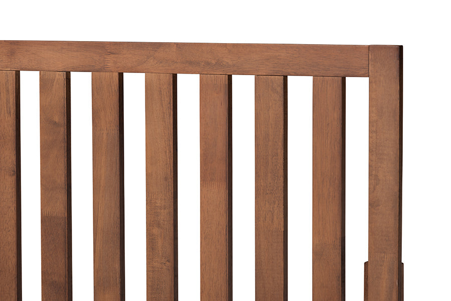 Create a cozy scene in your bedroom with the robust style of the Rowanne bed. Made in Malaysia, the Rowanne is constructed from walnut brown finished wood that easily coordinates with any color palette. Its slatted headboard allows light to flow more easily throughout the room, providing a more open feel in tight spaces. Requiring assembly, the Rowanne utilizes wood slats for mattress support, eliminating the need for a box spring. Angled legs lend mid-century charm, making the Rowanne bed a fantastic addition to any bedroom.