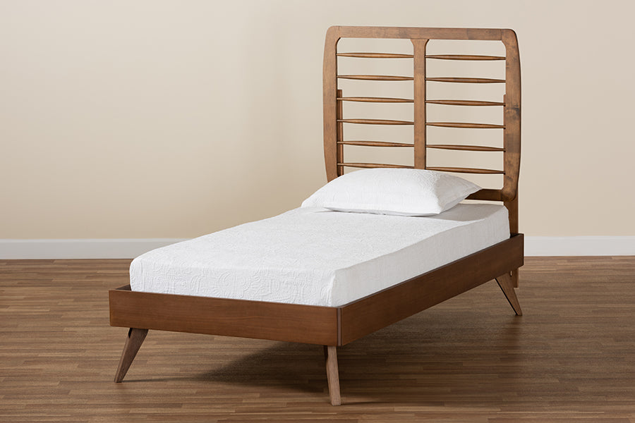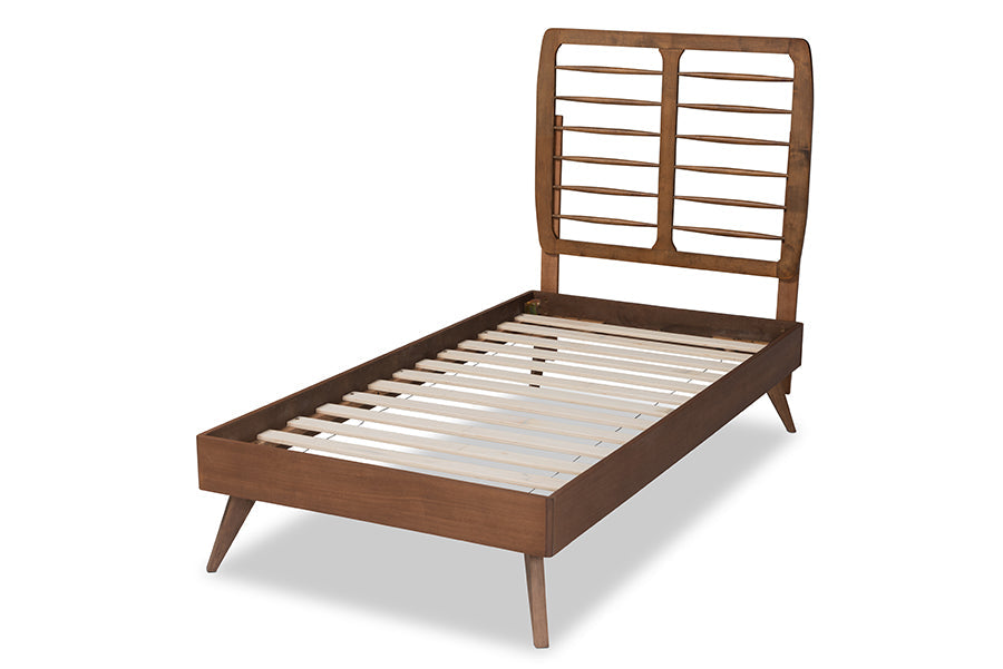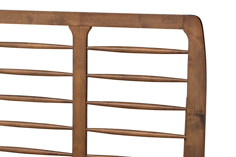Revamp your bedroom with the retro-inspired design of the Romilly bed. Made in Malaysia, the Romilly is constructed from wood showcasing a walnut brown finish that adds warmth to any space. Its spindle headboard allows light to flow more easily throughout the room and provides a more open feel in tight spaces. Requiring assembly, the Romilly utilizes wood slats for mattress support, eliminating the need for a box spring. A simple yet classy addition, the Romilly bed elevates the character of the modern home.