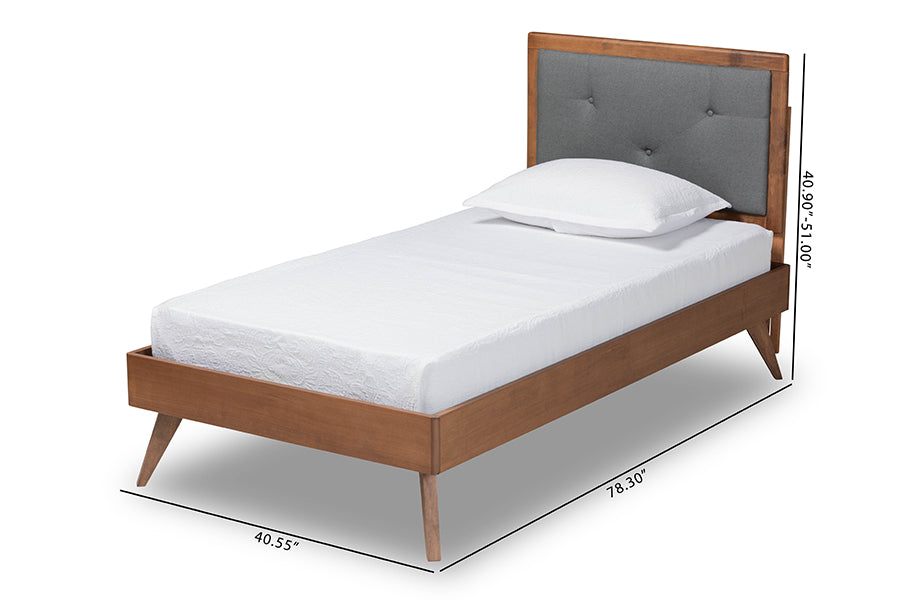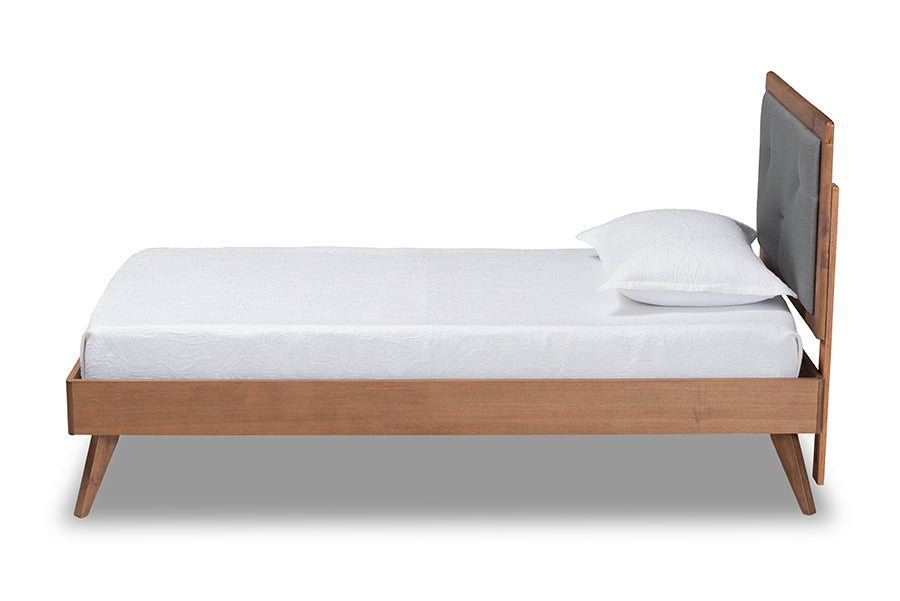 Transform your bedroom into an in-home retreat with the Sadiya bed. Made in Malaysia, this bed is constructed from sturdy wood that radiates warmth with a walnut brown finish. Its headboard is upholstered in soft fabric and padded with plush foam to provide superb comfort for you to lean against when sitting up in bed. Requiring assembly, the Sadiya utilizes wood slats for mattress support, which eliminate the need for a box spring. Button tufting adds a sophisticated touch, making the Sadiya bed an elegant enhancement to any bedroom.