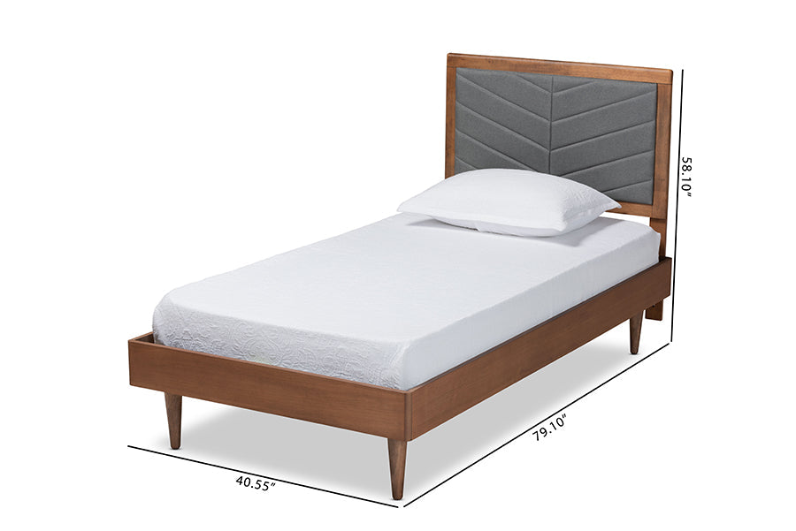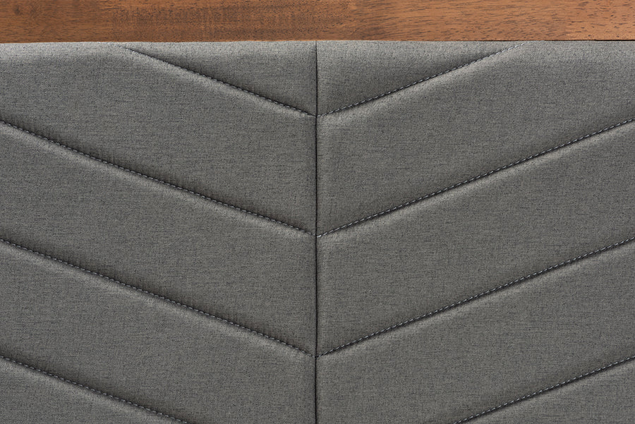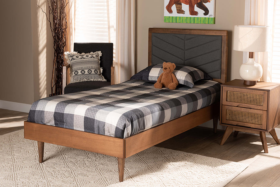 Arrange your bedroom with the sleek symmetry of the Reid bed. Made in Malaysia, this bed is constructed from sturdy wood in a walnut brown finish that adds natural warmth to any space. Its chevron tufted headboard establishes an alluring, geometric backdrop, while plush foam padding provides comfort for you to lean against when sitting up in bed. Requiring assembly, the Reid utilizes wood slats for mattress support, which eliminate the need for a box spring. A simple yet stunning addition, the Reid bed is a superb addition to any bedroom.