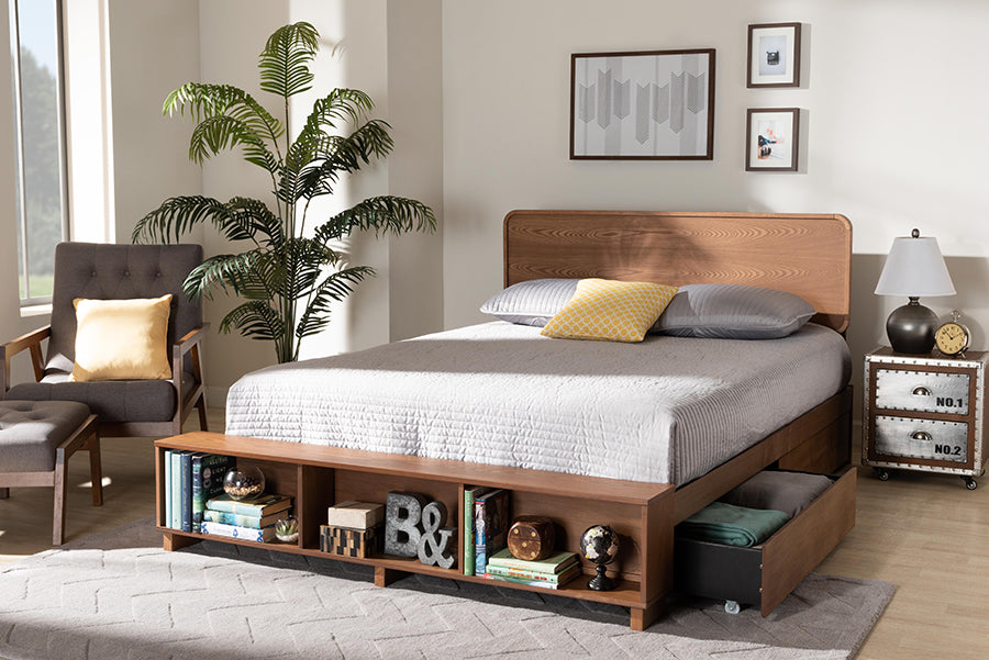 Enrich your bedroom with the convenience and versatility of the Swamson bed. Made in Malaysia, the Swamson is constructed from sturdy wood finished in a neutral ash walnut to easily blend in with a large variety of room layouts and styles. Four underside drawers, along with three spacious storage compartments located at the footboard, provide the Swamson with superb storage capability. Assembly is required and a box spring isn’t needed, as the bed comes with internal slats for mattress support. A smooth headboard with rounded edges showcases retro charm, distinguishing the Swamson bed as a stylish and efficient addition to any bedroom.