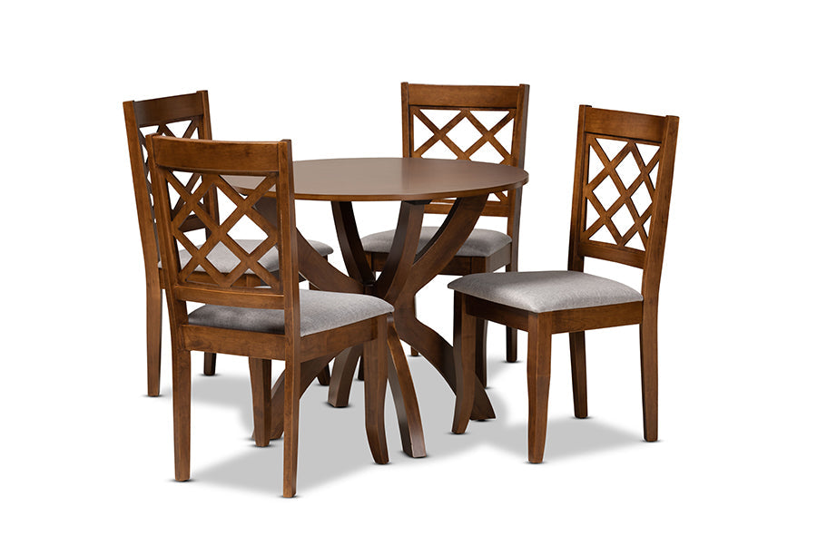 Superb comfort and contemporary design create the extraordinary Zaila dining set. Made in Malaysia, the set includes four dining chairs and one table constructed from sturdy wood in a warm walnut brown finish. Each chair is fitted with a foam-padded seat and upholstered in smooth grey fabric. Requiring assembly, the large, circular tabletop ensures plenty of elbow room for each member of the table. Well suited for both casual and formal dining, the Zaila dining set is an exceptional addition to any home.