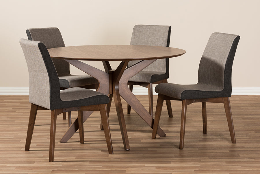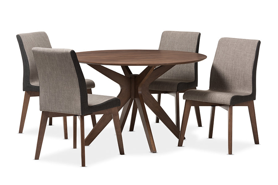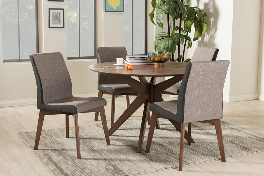 Channel retro styling in your contemporary space with the stunning Sariah mid-century modern round 5-piece dining det. Set includes one four-seater table and four matching dining side chairs for a complete setting. Table features round shape with mid-century curves for retro vibes. Dining chairs are constructed of rubberwood and are upholstered in two-tone brown and light brown polyester fabric, providing a soft-to-touch surface. Featuring high seat back for ultimate comfort while dining, the Sariah offers your home staple table space with understated minimalist style. Two-tone fabric contrasting effect and dark walnut stain form a neutral palette to complement a wide range of color schemes for your home. Made in Malaysia, the Sariah 5-piece dining set requires assembly.