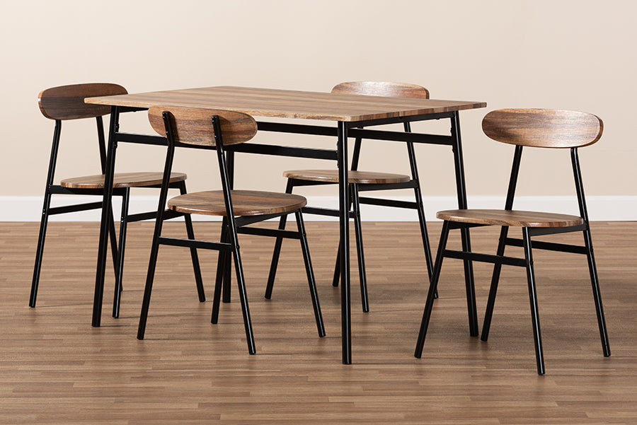 The Romina 5-piece dining set can add a lot of charm to your space without taking up too much of it. The rustic and industrial-inspired design is seen in the brown, natural look of the dining table's finish. The chair's circular seats and curved chair backs match the table top with the same eye-catching finish. The table and chairs of the Romina are constructed of sturdy metal with a matte black finish. One of the best features of the Romina dining set is that all four chairs and the dining table ship together in one box for convenience. Add this charming set to your dining room, breakfast nook, or other shared spaces. Made in China, the Romina requires assembly.