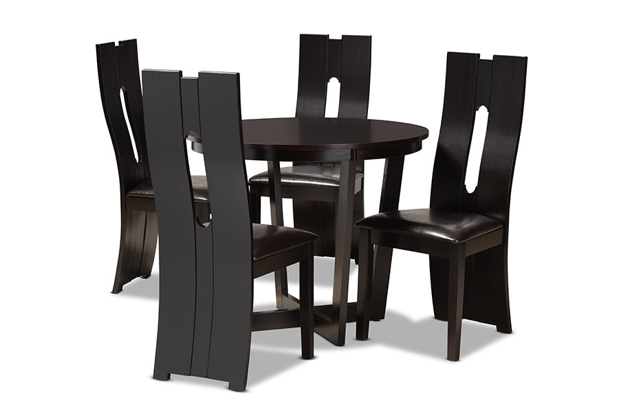 Exquisite attention to detail makes the Ridgely dining set a distinctive addition to any space. Made in Malaysia, this wooden set includes one table and four chairs, each upholstered in a sleek dark brown faux leather that matches the dark brown wood finish. Designed with both comfort and style in mind, each chair features a plush foam-padded seat, as well as a striking cut-out design on its back. The round tabletop is supported by an intersecting base, creating a chic, sculptural effect. Requiring assembly, the Ridgely dining set is well suited for both casual and formal dining.