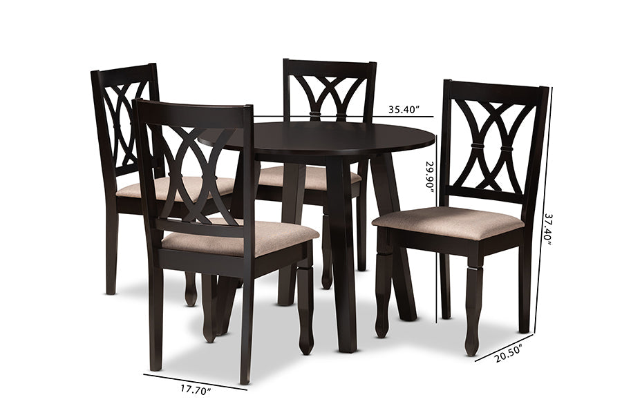 Featuring exquisite craftsmanship, the Norwich dining set adds elegance to any space. Made in Malaysia, this wooden set includes one table and four chairs, each upholstered in a light fabric that complements the dark brown wood finish. Designed with both comfort and style in mind, each chair features a plush foam-padded seat, as well as a striking cut-out design on its back. The round tabletop is supported by splayed legs, creating a stylish profile from any angle. Requiring assembly, the Norwich dining set elevates any dining experience.