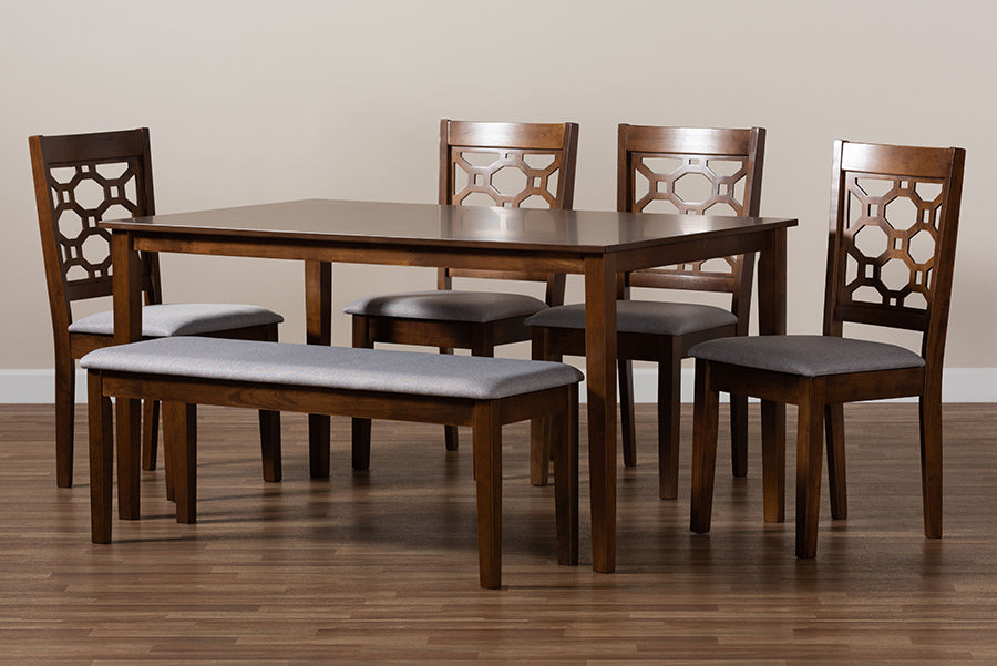 Update your dining space with the contemporary style of the Seanna 6-piece dining set. Made in Malaysia, the Seanna includes four dining chairs, one dining bench, and one table constructed from sturdy wood in a walnut brown finish that complements the light fabric upholstery. A splendid balance of both comfort and style, the Seanna features a plush foam-padded seat, as well as a unique cut-out design on its back. Requiring assembly, the large rectangular tabletop allows ample elbow room for each member of the table. Whether it's for casual meals or formal scenarios, the Seanna dining set easily modernizes any dining space.