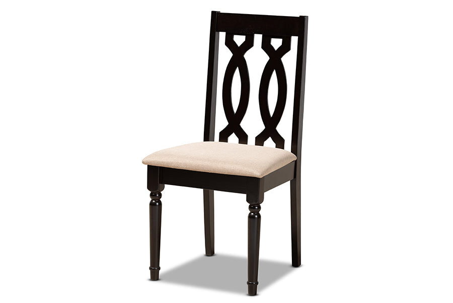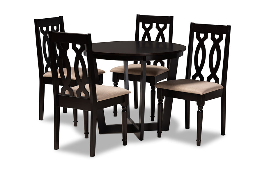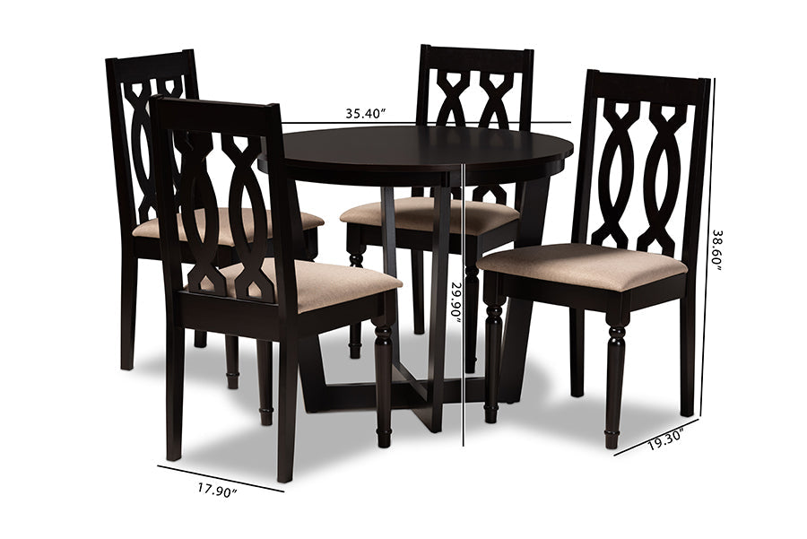 Elegance and comfort come together with the Paine dining set. Made in Malaysia, the Paine includes four chairs and one table constructed from sturdy wood finished in a rich dark brown. Each chair is fitted with a foam-padded cushion upholstered in a smooth sand tone fabric and features a unique cut-out design on its back. Requiring assembly, the circular tabletop allows ample elbow room for each member of the table. Ideal for both casual and formal occasions, the Paine dining set easily updates the modern home.
