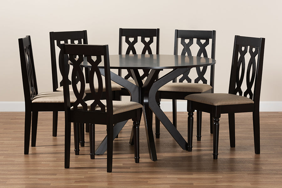 Elegance and comfort come together in the Sabriel dining set. Made in Malaysia, the Sabriel includes six chairs and one table constructed from sturdy wood finished in a rich dark brown. Each chair is fitted with a foam-padded cushion upholstered in a smooth sand tone fabric and features a unique cut-out design on its back. Requiring assembly, the circular tabletop provides ample elbow room for each member of the table. Ideal for both casual and formal occasions, the Sabriel dining set easily updates the modern home.