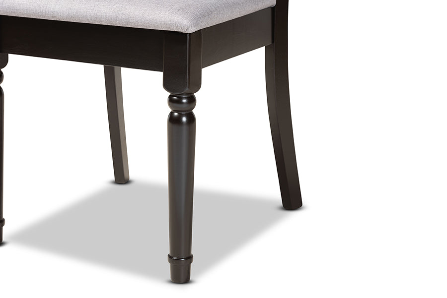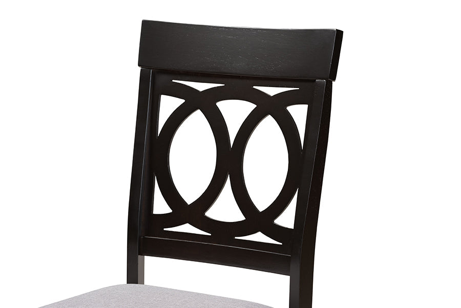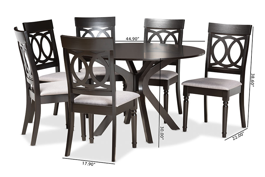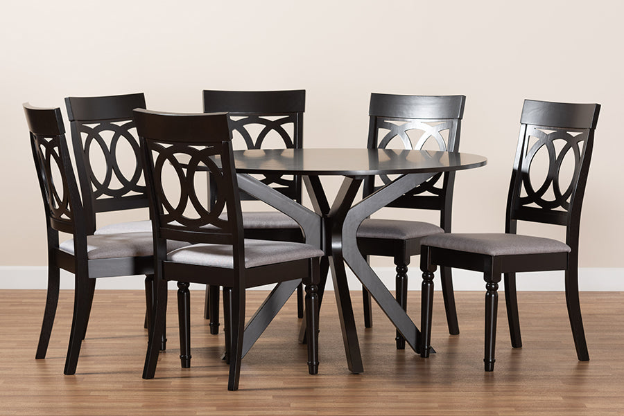 Enhance your dining space with the elegant style of the Sasa dining set. Made in Malaysia, this wooden set includes six dining chairs and one table. Each chair is upholstered in a light fabric that complements the rich dark brown finished wood. Designed with both comfort and style in mind, each chair features a plush foam-padded seat, as well as an exquisite cut-out design on its back. Requiring assembly, the round tabletop provides ample elbow room for each member of the table. Well suited for both casual meals and formal dining, the Sasa dining set is an excellent upgrade to the modern home.