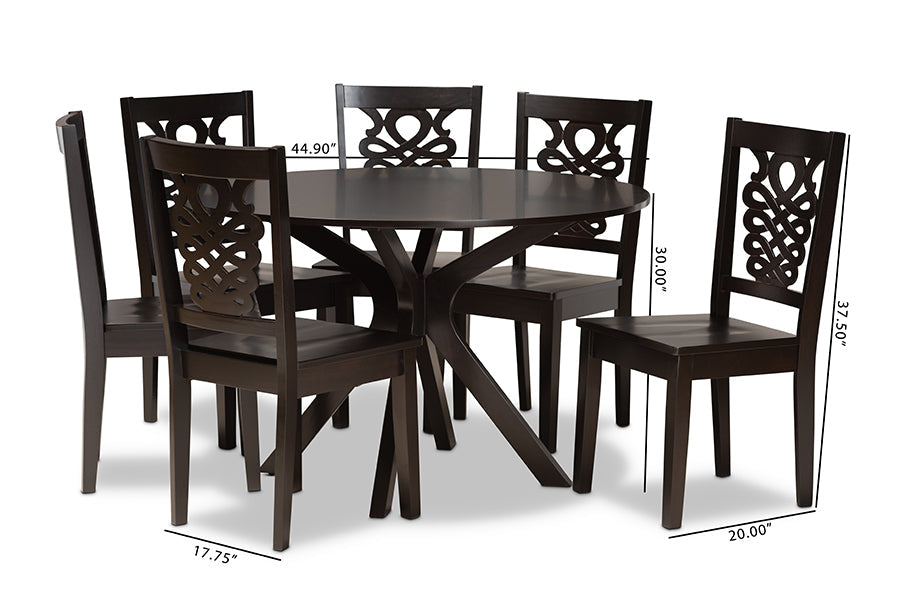 Imbue your dining space with the elegance of the finely crafted Racquel dining set. Made in Malaysia, this wooden set includes six chairs and one table showcasing a rich dark brown finish. Each chair features a stunning geometric cut out design on its backrest for added visual appeal, while a scoop seat lends casual comfort. Requiring assembly, the circular tabletop provides ample elbow room for each member of the table. Elegant and comfortable, the Racquel dining set elevates any dining experience.