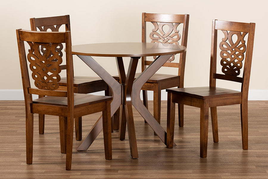 Imbue your dining space with the elegance of the finely crafted Racquel dining set. Made in Malaysia, this wooden set includes four chairs and one table showcasing a warm walnut brown finish. Each chair features a stunning geometric cut out design on its backrest for added visual appeal, while a scoop seat lends casual comfort. Requiring assembly, the circular tabletop provides ample elbow room for each member of the table. Elegant and comfortable, the Racquel dining set elevates any dining experience.