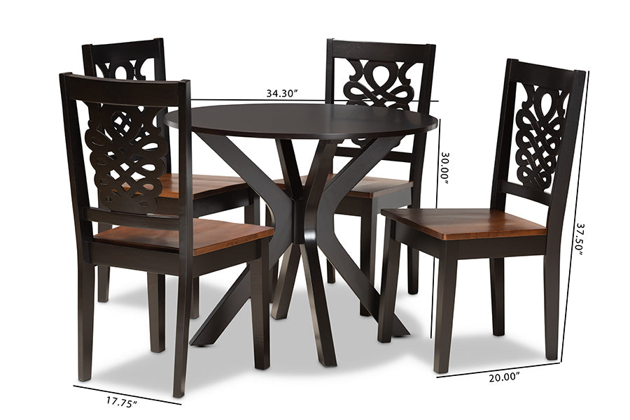 Imbue your dining space with the elegance of the finely crafted Racquel dining set. Made in Malaysia, this wooden set includes four chairs and one table showcasing a rich dark brown finish. Each chair features a stunning geometric cut out design on its backrest for added visual appeal, while a walnut brown finished wood scoop seat lends casual comfort. Requiring assembly, the circular tabletop provides ample elbow room for each member of the table. Elegant and comfortable, the Racquel dining set elevates any dining experience.