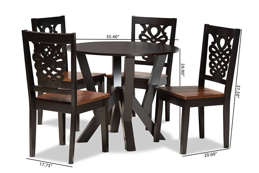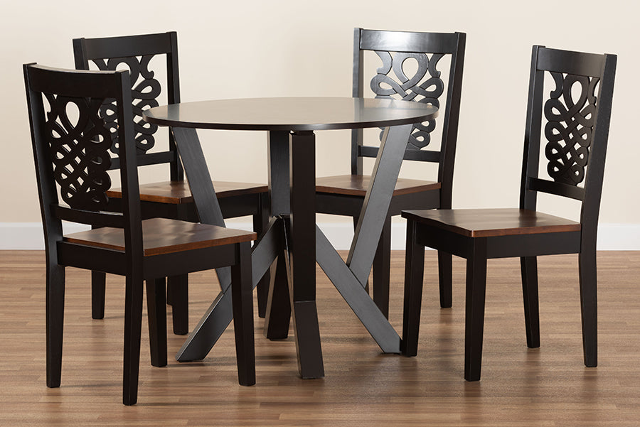 Imbue your dining space with the elegance of the finely crafted Renata dining set. Made in Malaysia, this wooden set includes four chairs and one table showcasing a rich dark brown finish. Each chair features a stunning geometric cut out design on its backrest for added visual appeal, while a walnut brown finished wood scoop seat lends casual comfort. Requiring assembly, the circular tabletop provides ample elbow room for each member of the table. Elegant and comfortable, the Renata dining set elevates any dining experience.