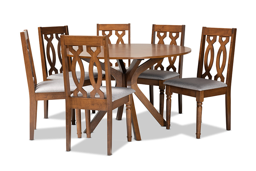 Elegance and comfort come together in the Sabriel dining set. Made in Malaysia, the Sabriel includes six chairs and one table constructed from sturdy wood finished in a warm walnut brown. Each chair is fitted with a foam-padded cushion upholstered in a smooth grey fabric and features a unique cut-out design on its back. Requiring assembly, the circular tabletop provides ample elbow room for each member of the table. Ideal for both casual and formal occasions, the Sabriel dining set easily updates the modern home.