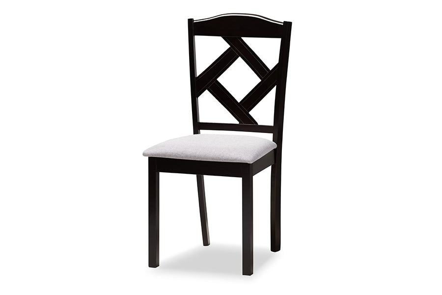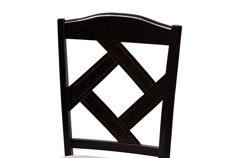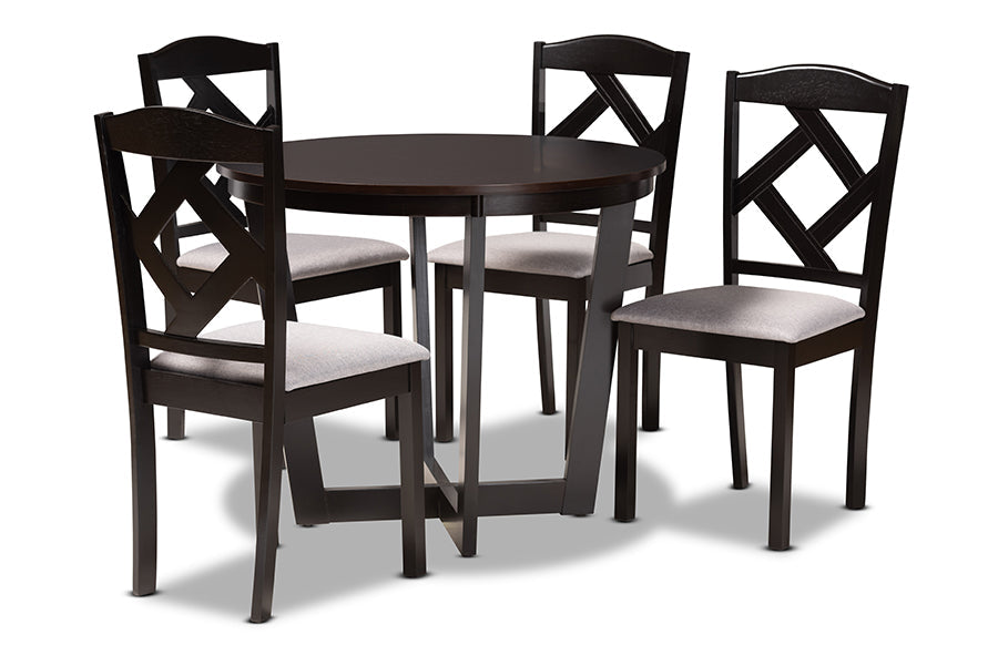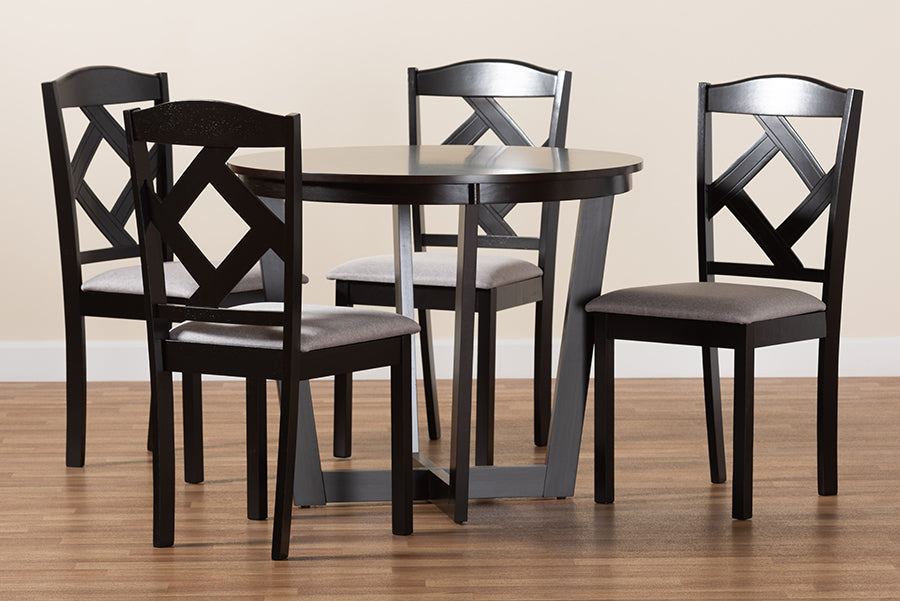 Enjoy everyday meals and casual gatherings with the Rylie dining set. Made in Malaysia, this set includes four dining chairs and one table constructed from wood displaying a rich dark brown finish. Each chair features a plush foam padded seat upholstered in soft fabric, as well as a geometric cut-out design on its back, for a striking blend of comfort and style. Requiring assembly, the wide, circular tabletop provides ample elbow room for each member at the table. Perfect for enjoying nights with friends and family, the Rylie dining set elevates any dining experience.