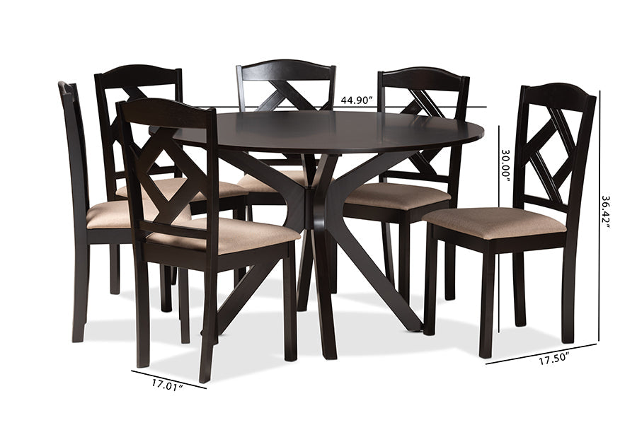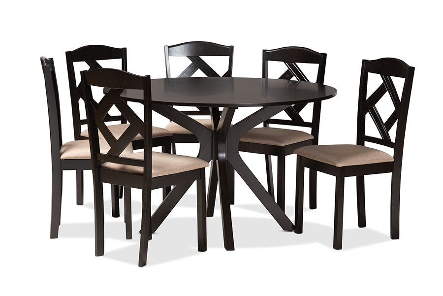 Indulge in everyday meals and casual gatherings with the Tabanan 7-piece dining set. Made in Malaysia, this set includes six dining chairs and one table constructed from wood displaying a rich espresso brown finish. Each chair features a plush foam padded seat upholstered in soft fabric along with a geometric cut-out design on their backs for a striking blend of comfort and style. Requiring assembly, the wide, circular tabletop of the Tabanan ensures ample elbow room for each member of the table. Perfect for enjoying nights with friends and family, the Tabanan dining set elevates any dining experience.