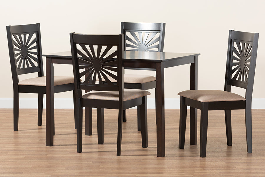 Instill your space with a sense of nonchalant refinement with the remarkable Silas dining set. Made in Malaysia, this modern set includes four chairs and one table constructed from sturdy wood. Each chair is padded with plush foam and upholstered in sumptuous fabric while the backrest exhibits a stunning sunburst design for a visually arresting display. The Silas requires assembly and features a rectangular tabletop with crisp edges to offer ample room for each member of the table. Evocative of traditional design with an eclectic spin, the Silas dining set brings unmatched character to any layout.