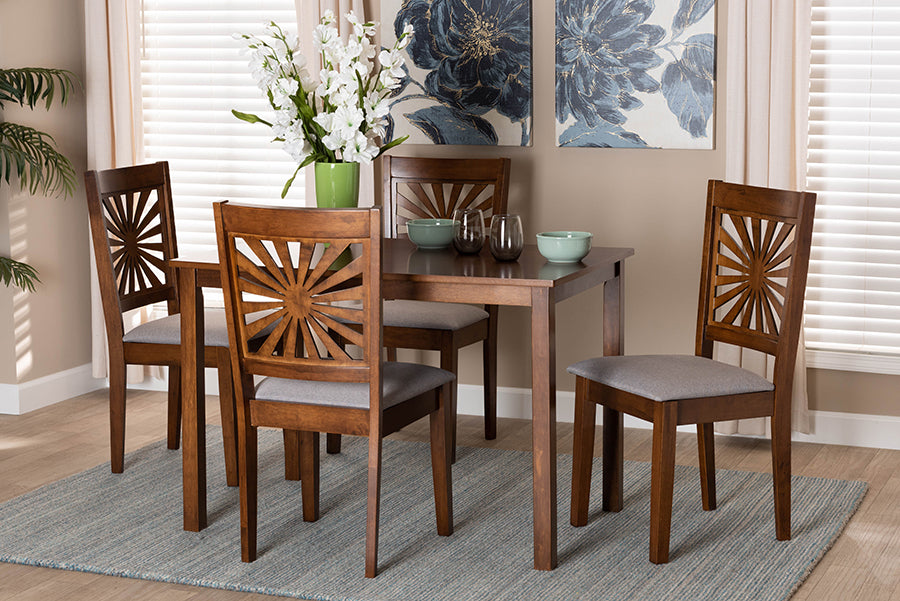 Instill your space with a sense of nonchalant refinement with the remarkable Silas dining set. Made in Malaysia, this modern set includes four chairs and one table constructed from sturdy wood. Each chair is padded with plush foam and upholstered in sumptuous fabric while the backrest exhibits a stunning sunburst design for a visually arresting display. The Silas requires assembly and features a rectangular tabletop with crisp edges to offer ample room for each member of the table. Evocative of traditional design with an eclectic spin, the Silas dining set brings unmatched character to any layout.