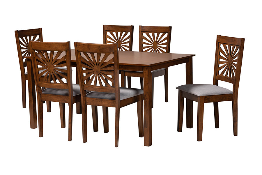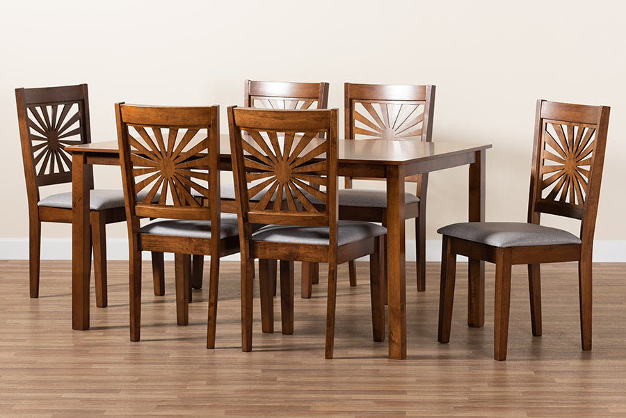 Instill your space with a sense of nonchalant refinement with the remarkable Silas dining set. Made in Malaysia, this modern set includes six chairs and one table constructed from sturdy wood. Each chair is padded with plush foam and upholstered in sumptuous fabric while the backrest exhibits a stunning sunburst design for a visually arresting display. The Silas requires assembly and features a rectangular tabletop with crisp edges to offer ample room for each member of the table. Evocative of traditional design with an eclectic spin, the Silas dining set brings unmatched character to any layout.