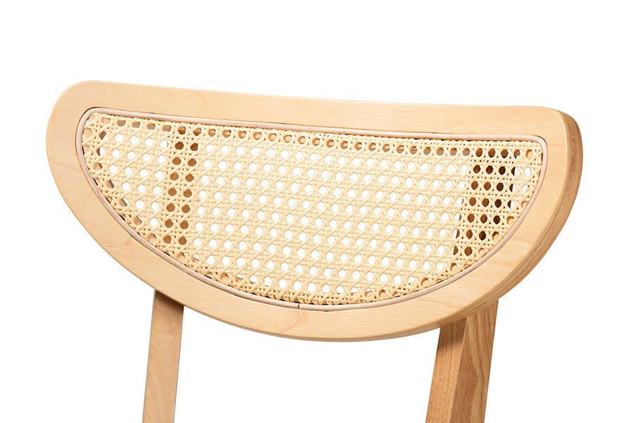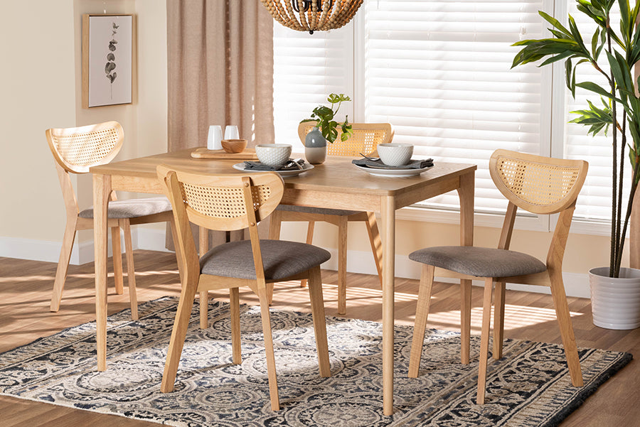 Enrich every occasion with the traditional composure of the Wren dining set. Made in Malaysia, this mid-century set includes four dining chairs and one table crafted from sturdy wood. Each seat is padded with plush foam and upholstered in soft fabric while the backrests showcase beautifully woven rattan for an invitingly cozy display. The Wren requires assembly and features a broad rectangular tabletop with smooth edges to accommodate each member of the table. Striking a poise of timeless charm, the Wren dining set creates an invigorating arrangement.