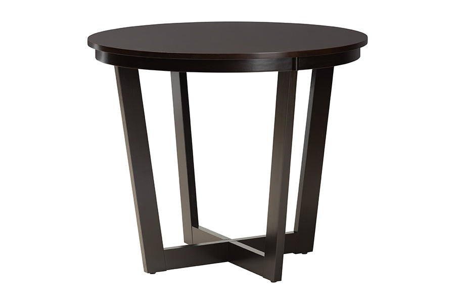 Redefine your dining space with the elegance and comfort of the Siskal dining set. Made in Malaysia, this modern set includes one table and four chairs crafted from sturdy wood. Designed with both comfort and style in mind, each chair features a plush foam-padded seat upholstered in soft fabric, as well as a striking cut-out design on its back. The Siskal requires assembly and features a round tabletop supported by an intersecting base for a chic, sculptural effect. Well suited for both casual and formal dining, the Siskal dining set uplifts any layout.