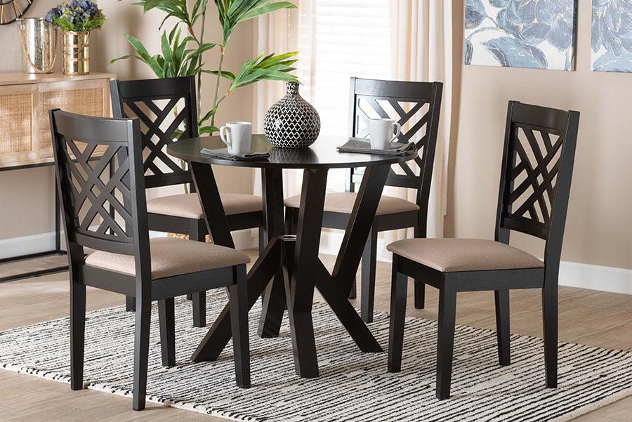 Redefine your dining space with the elegance and comfort of the Seda dining set. Made in Malaysia, this modern set includes one table and four chairs crafted from sturdy wood. Designed with both comfort and style in mind, each chair features a plush foam-padded seat upholstered in soft fabric as well as a striking cut-out design on its back. The Seda requires assembly and features a round tabletop supported by an intersecting base for a chic, sculptural effect. Adaptable for both casual meals and formal dining, the Seda dining set refreshes any arrangement.