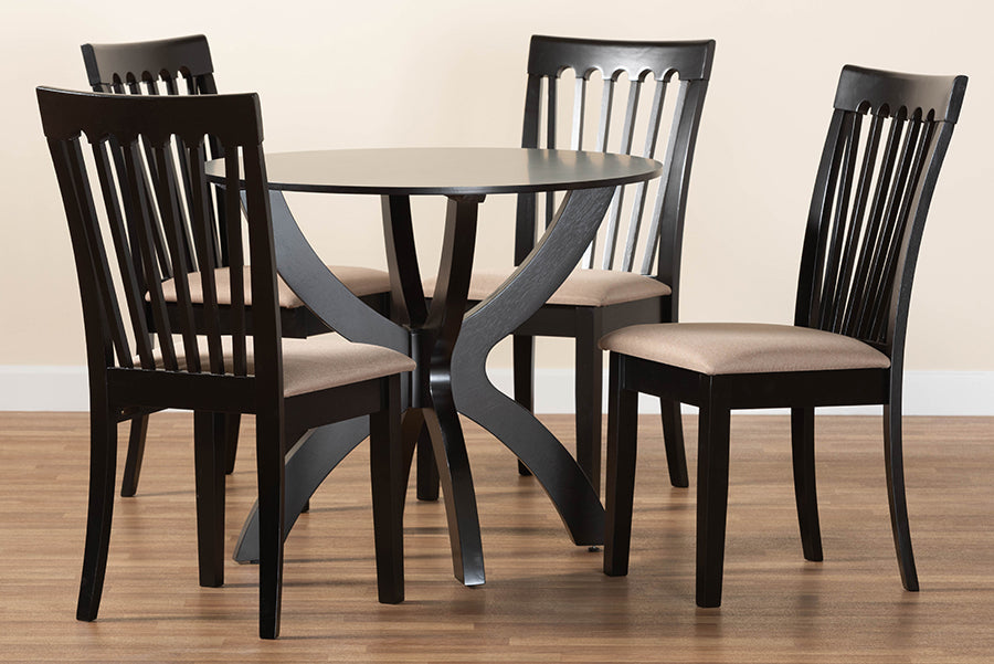Timeless design is merged with modern comfort in the Tabitha dining set. Made in Malaysia, this modern set includes one table and four chairs crafted from sturdy wood. Each chair is fitted with a foam-padded cushion upholstered in soft fabric as well as a striking cut-out design on its back for enhance visual appeal. that complements the walnut brown wood finish. The Tabitha requires assembly and features a circular tabletop that provides ample elbow room for each member of the table. An optimal balance of comfort and style, the Tabitha dining set is sure to elevate any dining experience.