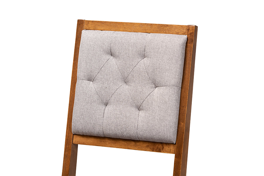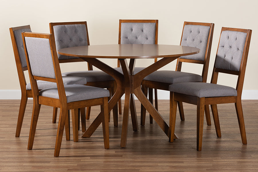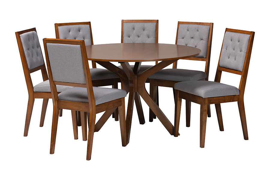 Synthesize an elegant aura for every dining occasion with the lovely Rosine dining set. Made in Malaysia, this modern set includes six chairs and one table crafted from sturdy wood. The plush seat and backrest of the chairs are upholstered in soft fabric, while a graceful diamond-tufted design exhibits refined personality. The Rosine requires assembly and features a round tabletop with smooth curves to accommodate each member of the table. The splayed legs of the table create a chic profile from any angle, making the Rosine dining well suited as the foundation of any arrangement.