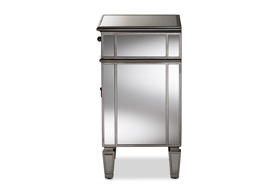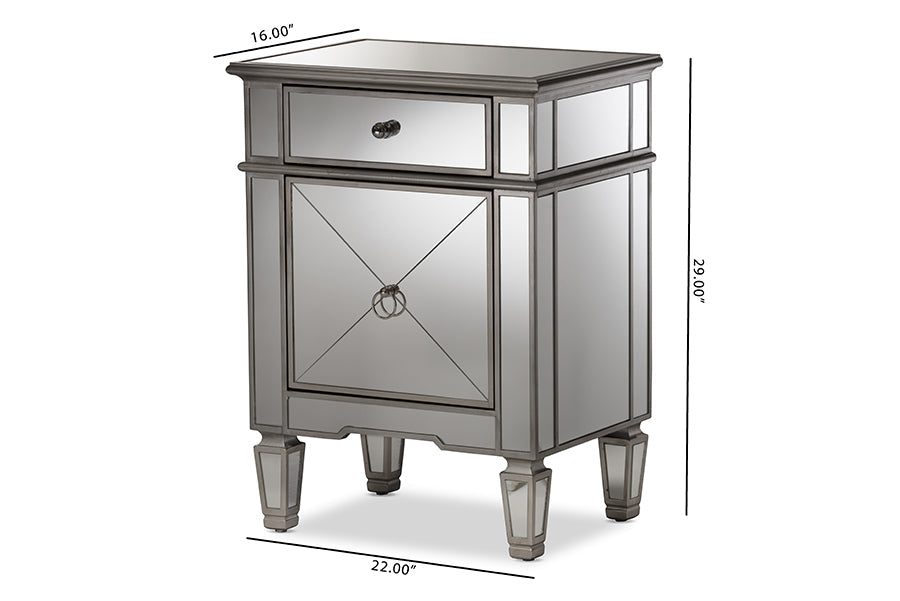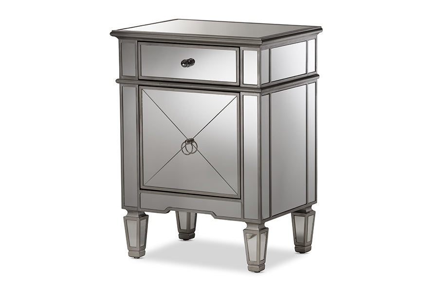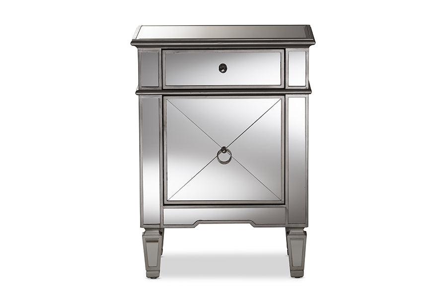Featuring Hollywood glamour style, the Tarun mirrored end table has a silver lacquered edge and mirrored panels with crosshatch details. The Tarun will add light, sparkle and luxury to your interior as well as space for storing household items. Constructed of MDF and encased with mirror, the Tarun features one drawer and one door with nickel drawer pull and ring. The attached mirrored feet with silver edge elevates the height of the Tarun to go with your arrangement. Made in China, the Tarun will arrive fully-assembled.