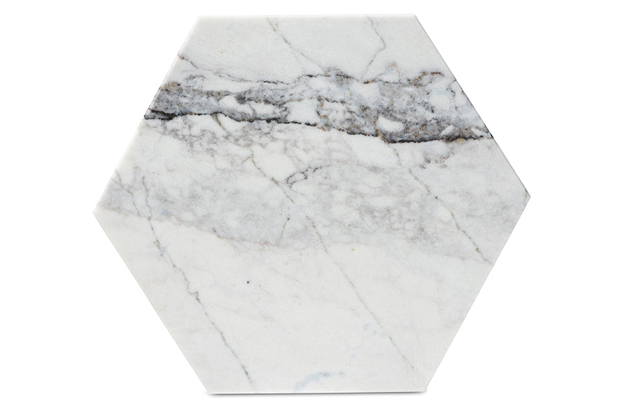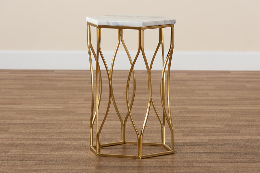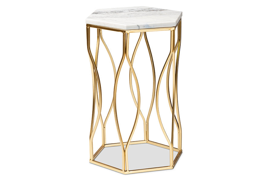 Give your space a beautiful yet practical accent of modern design with the Sussie end table. Made in China, this lovely piece is comprised of a solid metal base topped with a clean marble tabletop. The base features a smooth openwork design that allows light to flow more easily throughout the room. The Sussie will arrive fully assembled and utilizes a hexagon-shaped tabletop with crisp angles that exude geometric charm. A convenient and compact addition, the Sussie injects modern glamour to any interior space.