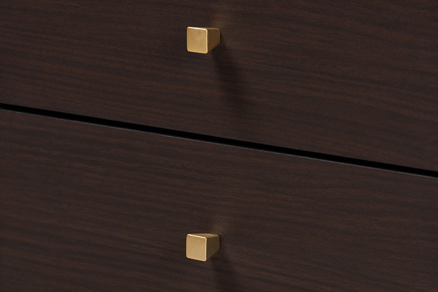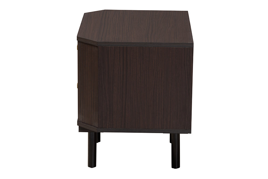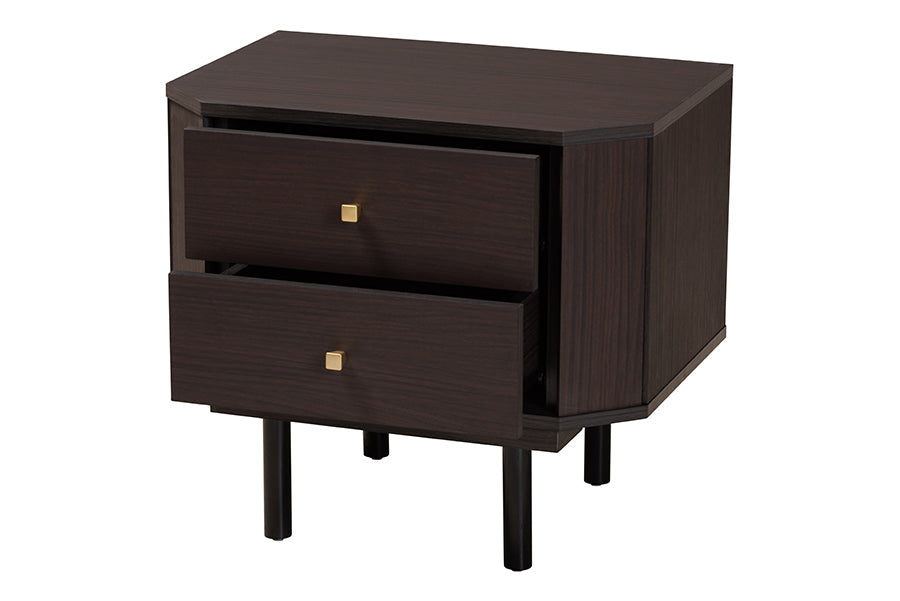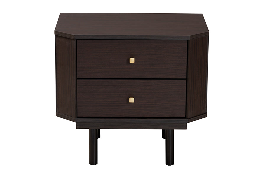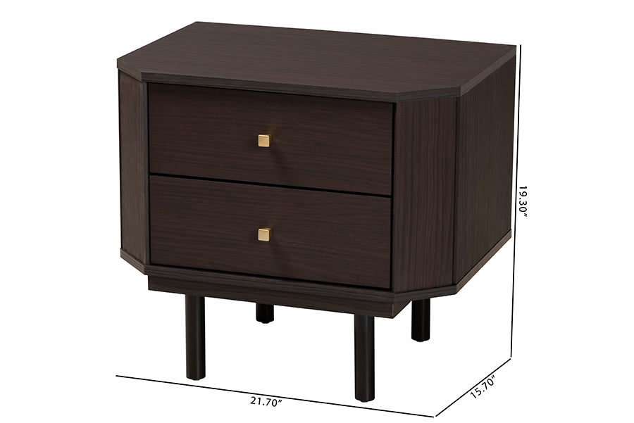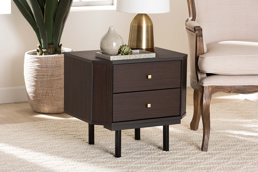 Bring the flare of modern craftsmanship to your space with the remarkable charm of the Regina end table. Made in Malaysia, this striking piece is crafted from sturdy wood. Two drawers offer space to organize a variety of household essentials while reserving the tabletop for daily use. The Regina requires assembly and is adorned with tapered drawer knobs for an added touch of geometric allure. Rounded legs accentuate the eye-catching design of the piece, making the Regina end table an unforgettable fixture of any arrangement.
